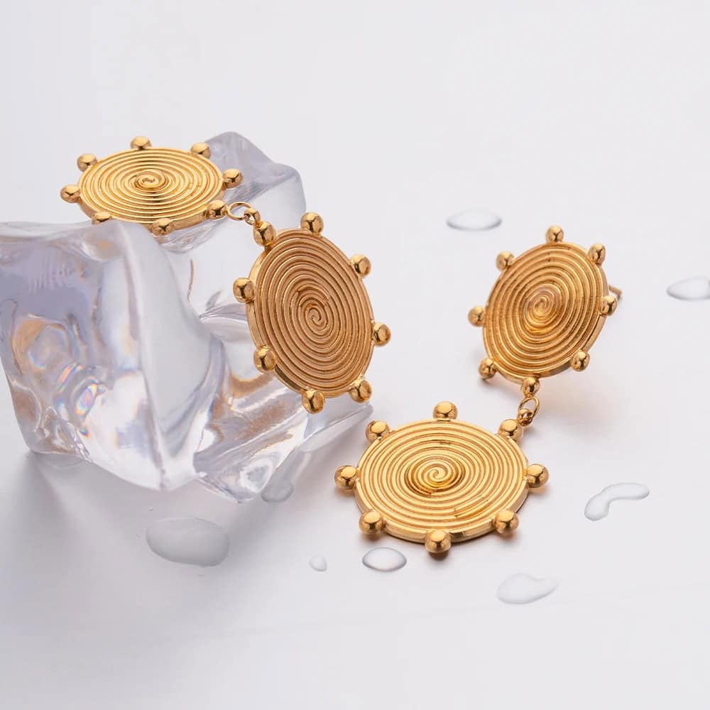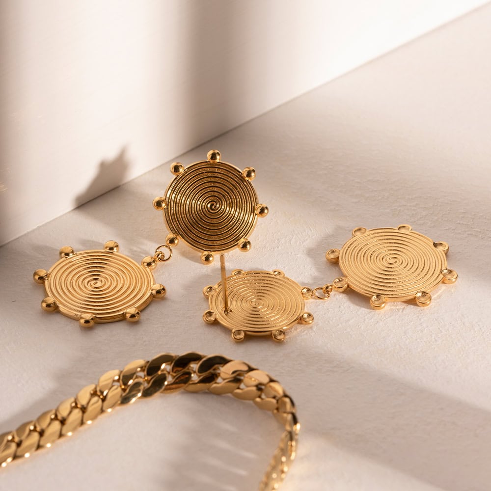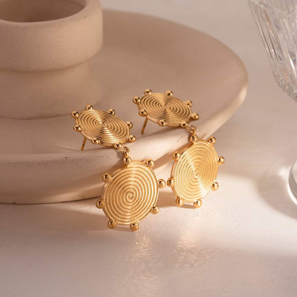 Elevate your style with our exquisite Luxury Temperament Disc Textured Threaded Earring, a masterpiece in palace-style retro fashion. Crafted from high-quality stainless steel and adorned with a lavish 18k gold plating, these earrings are designed to make a statement and stand the test of time.