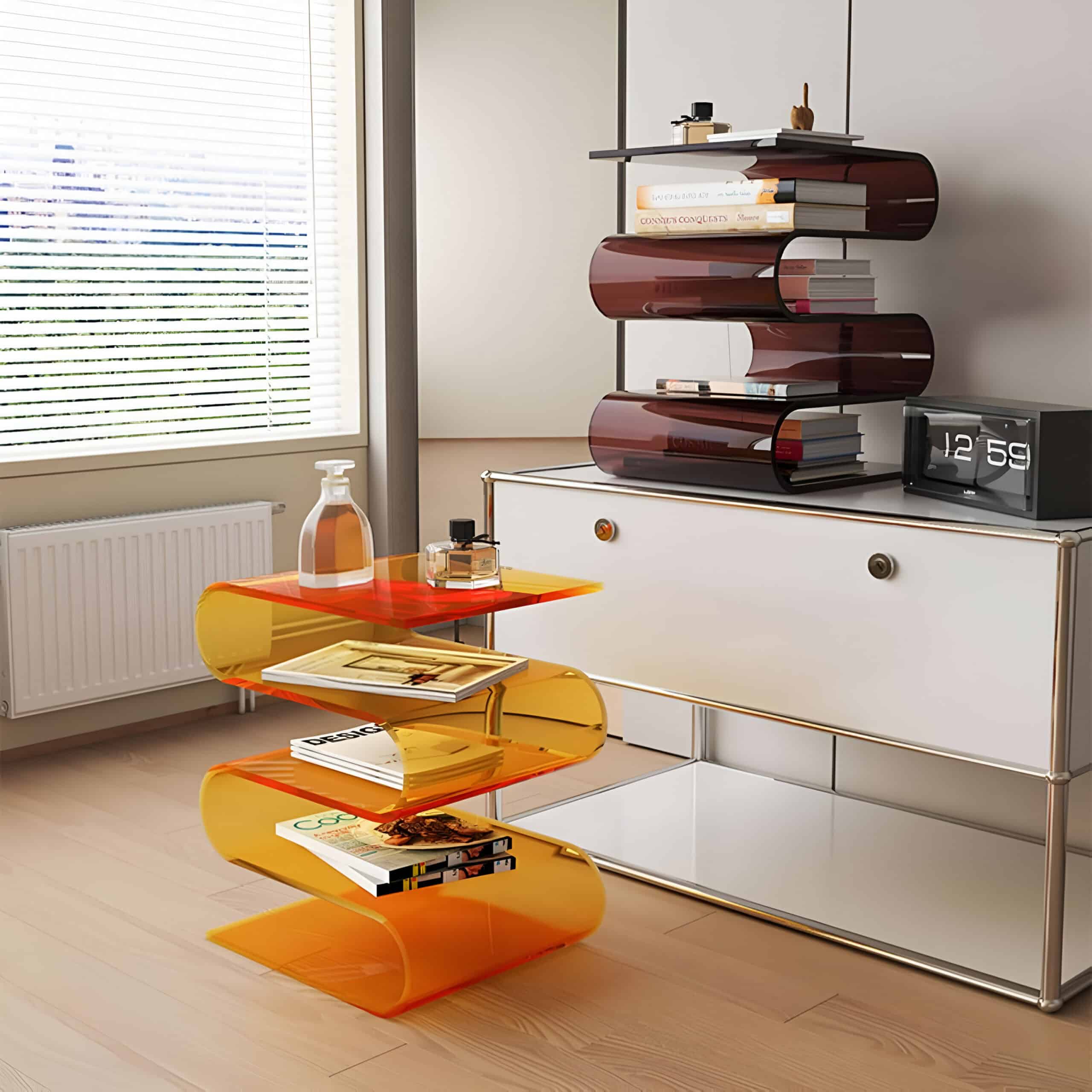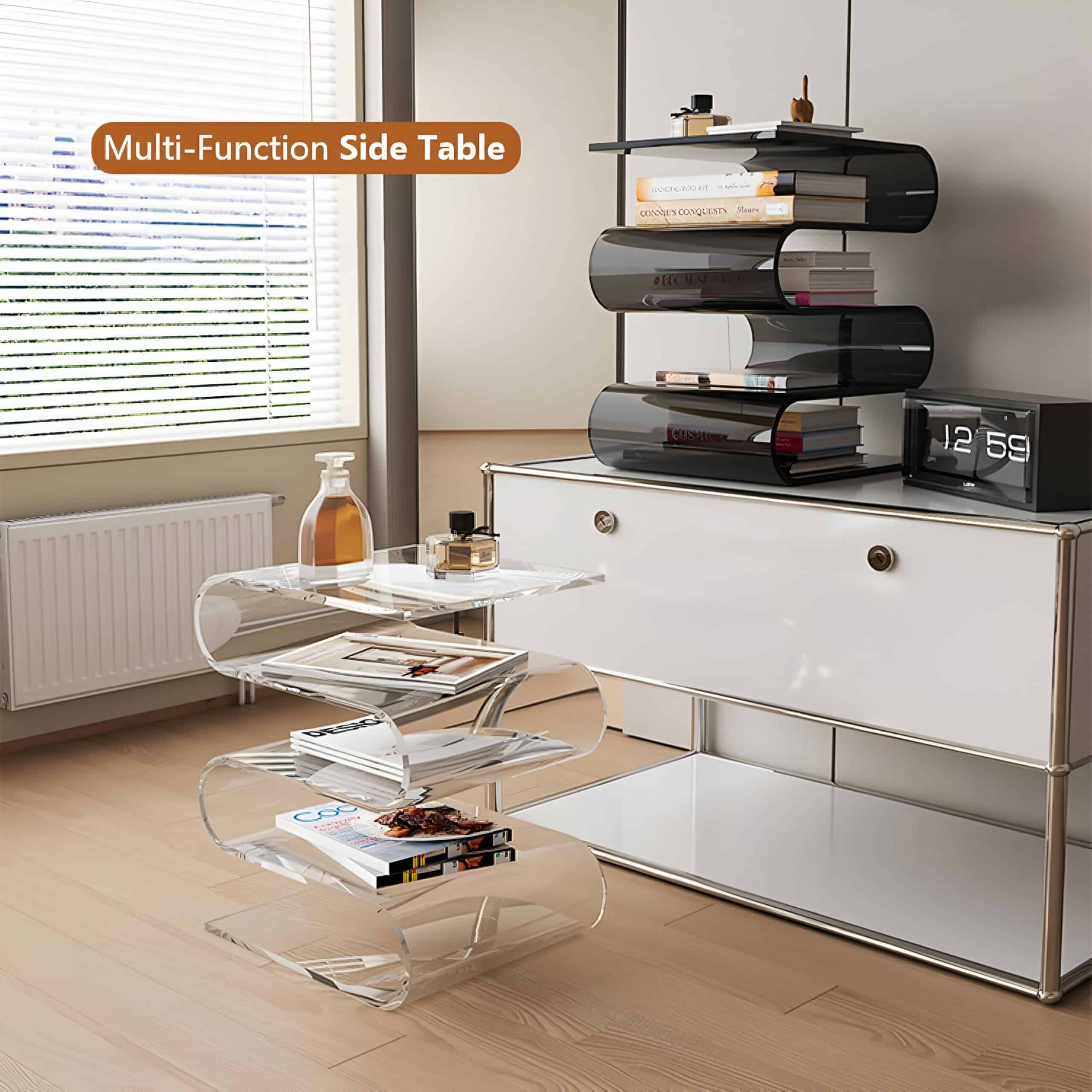 What sets this table apart is its combination of modern style and practicality. The transparent design creates an illusion of space, making rooms feel larger and brighter. Its integrated storage solution is not just functional but also keeps your space clutter-free and elegant. This side table complements a wide range of décor styles, from minimalist to classic European and American interiors.