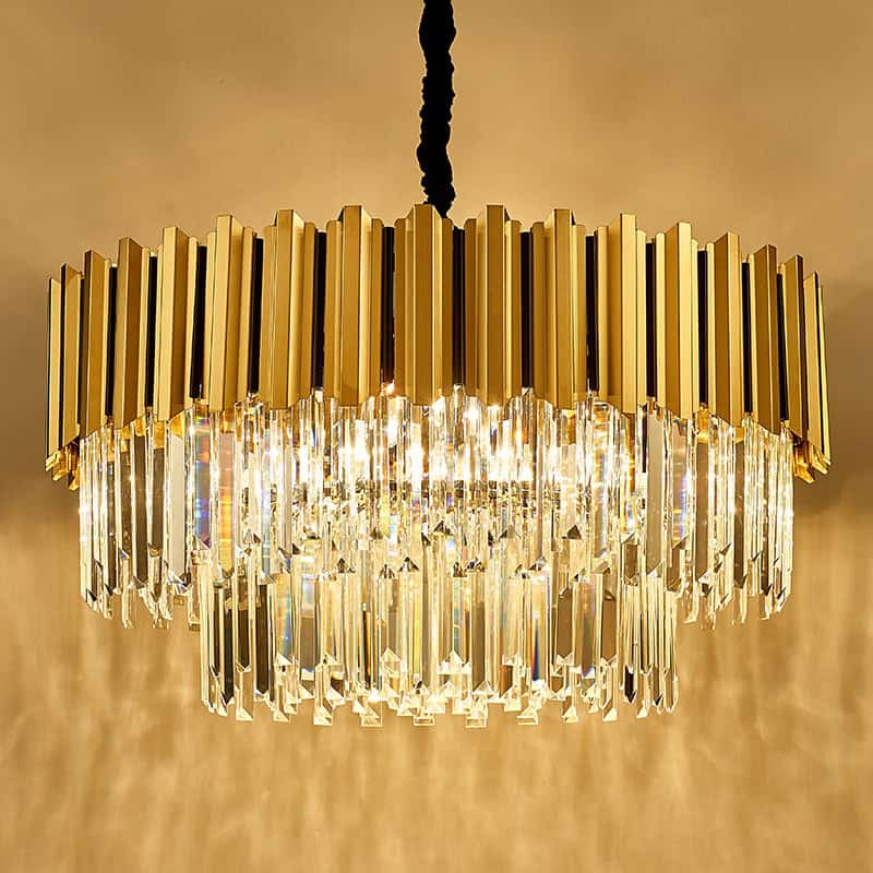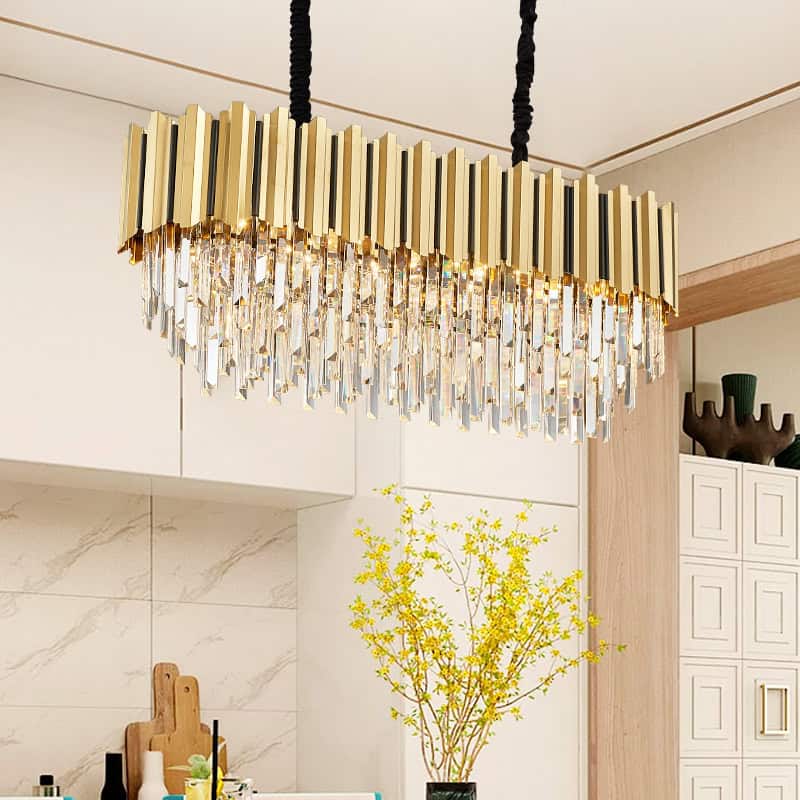 Elegant modern chandelier with crystal accents and gold finish, ideal for luxury interior decor in upscale homes and hotels.