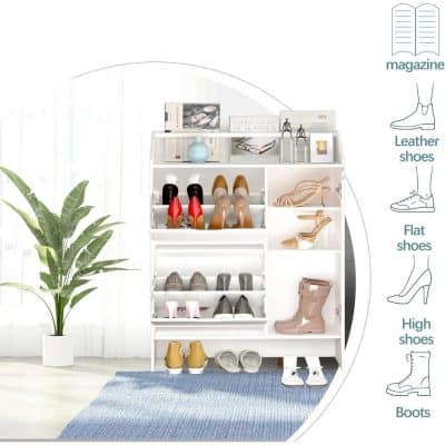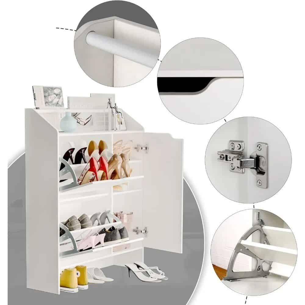 The thoughtful design extends to the distance between the cabinet bottom and the ground, preventing moisture and increasing storage space. Its slim profile allows placement in narrow spaces, keeping your shoes dust-free. The pure white color adds a vibrant touch to your room, enhancing its overall aesthetic.