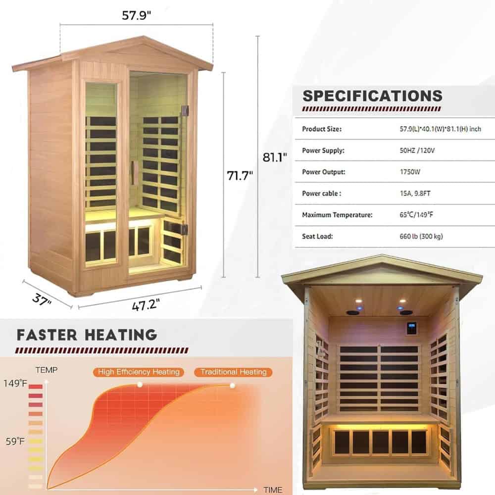 • Space-Saving Design: Compact and spacious, this 2-person sauna offers ample room with an internal size of 39.4 inches by 33.5 inches, comfortably fitting individuals up to 6.3 feet tall.