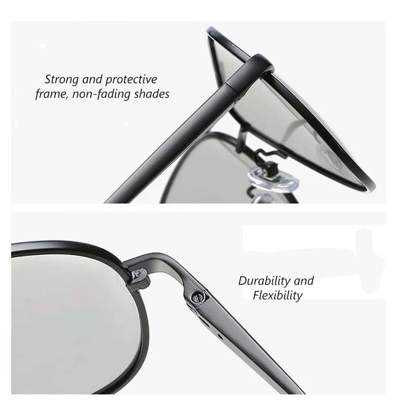 What sets our Photochromic Pilot Sunglasses apart is their ability to adapt to changing light conditions, providing you with clear vision and uncompromised style day or night. Embrace the convenience and versatility of eyewear that’s designed to keep up with your active lifestyle, ensuring you always look and feel your best.