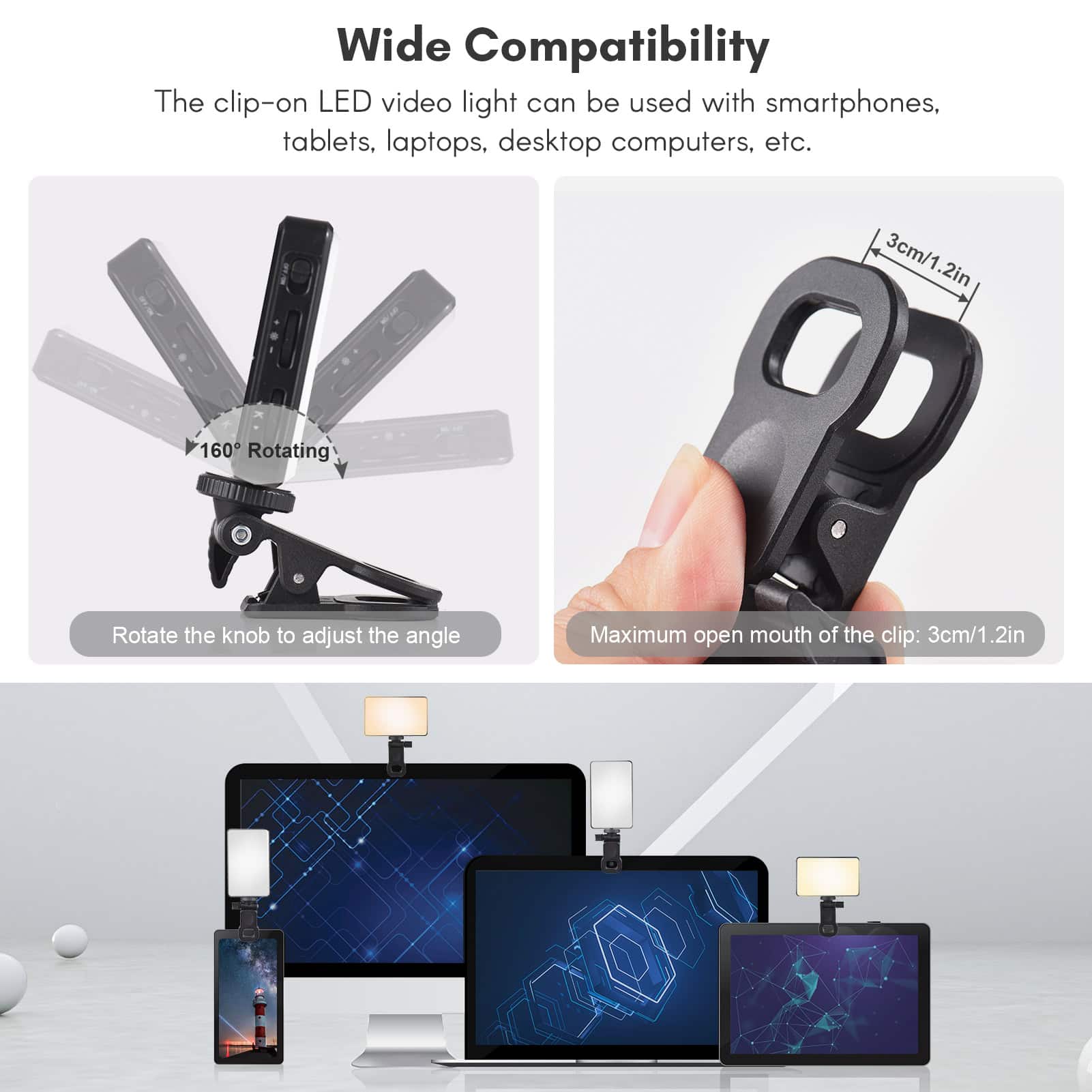 - Space-Saving Clip-On Design: The sturdy clip securely attaches to your laptop, desktop, tablet, or smartphone, with anti-slip rubber pads to prevent scratches.