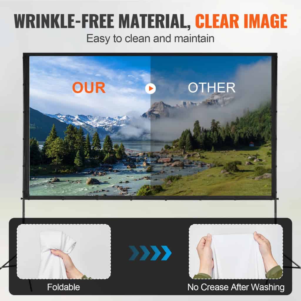 Designed for ultimate convenience, this portable projector screen is perfect for both indoor and outdoor use. Its 4K HD resolution ensures clear, bright images in any lighting, while the wide 160° viewing angle lets everyone enjoy the action, no matter where they are seated. With an easy-to-use stand, simple setup process, and sturdy design, it’s built to perform under any conditions. Plus, the wrinkle-free fabric and easy maintenance mean you can enjoy stunning visuals for years to come.