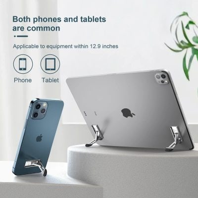 Introducing our sleek and versatile Portable Desktop Phone Holder, a must-have accessory for your iPhone 12, 13 Pro Max, Xiaomi, tablet, or any smartphone and tablet within 12 inches. Crafted from premium aluminum alloy, this invisible mini adhesive non-slip phone stand is both solid and durable, providing a secure grip for your device.