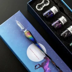 This unique set features a stunning glass dip pen with a starry, rainbow-textured body that catches the light with every stroke. Included in this set is a 45ml bottle of vibrant watercolor ink, allowing for a seamless transition between colors and a delightful exploration of artistic expressions. The pen’s design not only enhances your writing and drawing experience but also serves as a beautiful desk ornament.