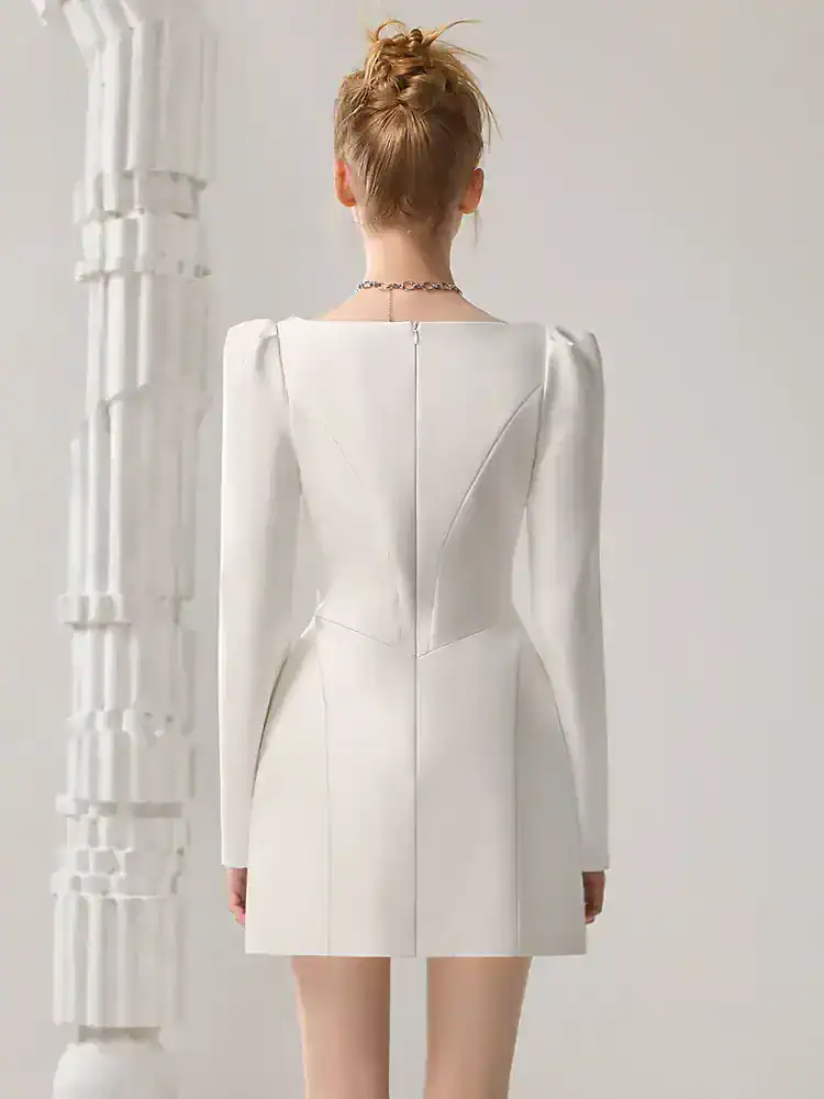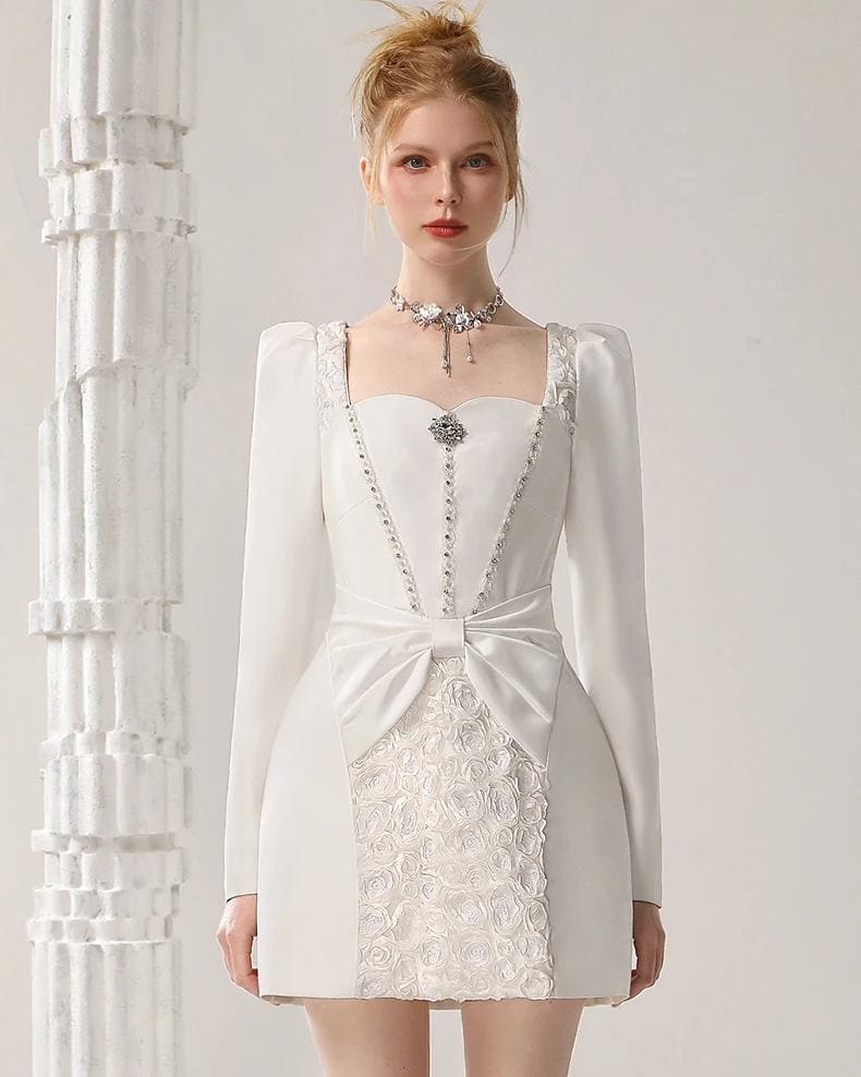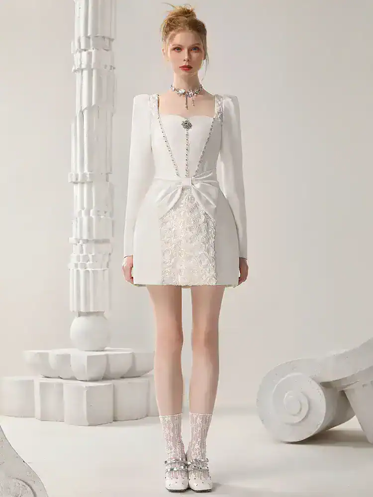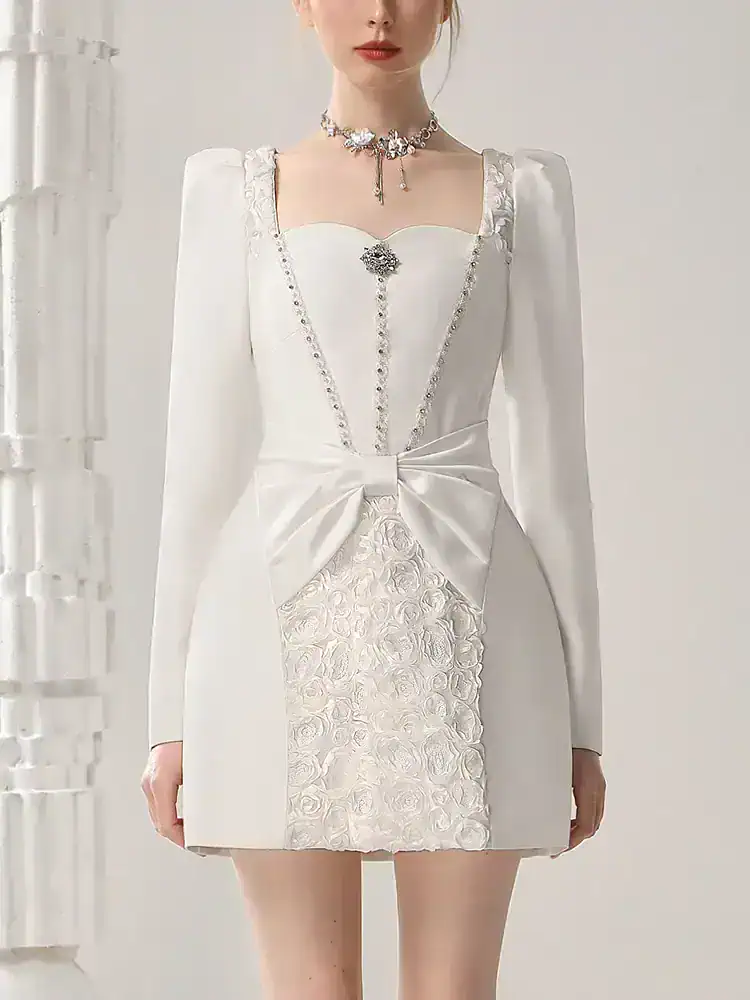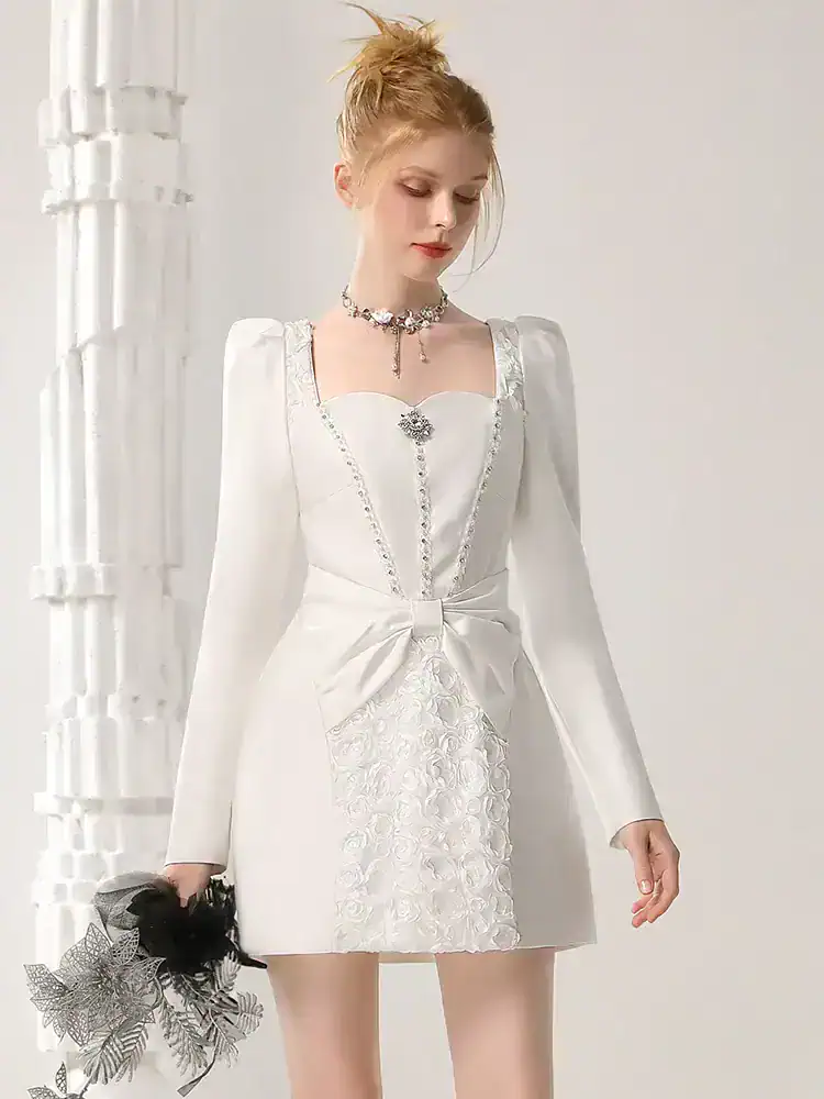 Discover the perfect blend of sophistication and femininity with this romantic white mini dress. Featuring a charming square neckline and a stunning three-dimensional bow detail, this dress is a timeless choice for the modern woman. Designed to highlight your natural grace, it offers a slim A-line silhouette that enhances your figure while exuding effortless elegance. Perfect for autumn, this dress is ideal for date nights, parties, or any occasion that calls for a touch of romance.