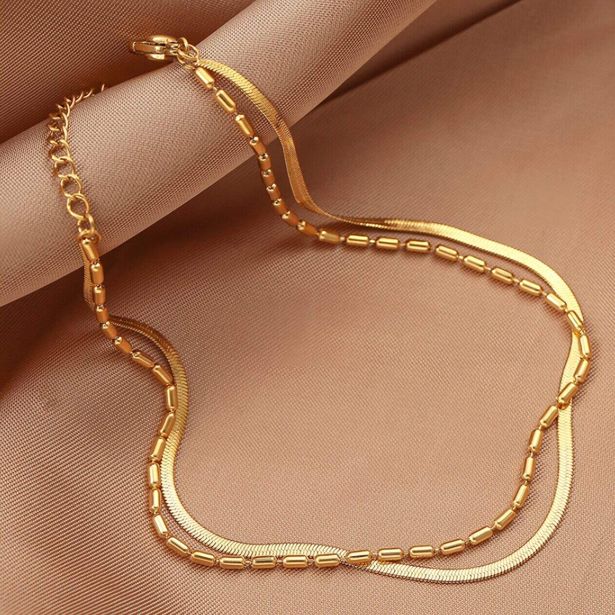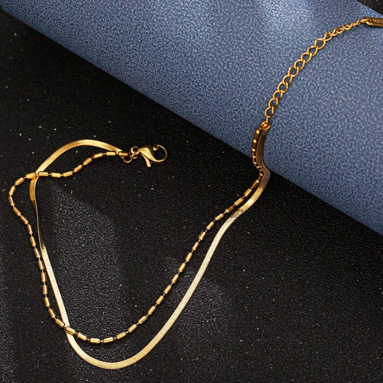 With a sleek snake bone chain adorned with delicate beads, this anklet exudes sophistication and charm. Its two-layer design adds depth and dimension to your ensemble, making it the perfect accessory for any occasion.
