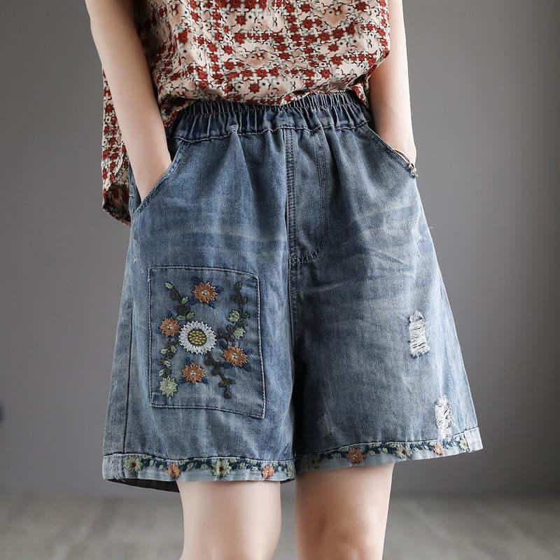 Embroidered denim shorts with floral patchwork and distressed details, perfect for stylish casual wear. Features an elastic waistband and deep pockets for comfort.