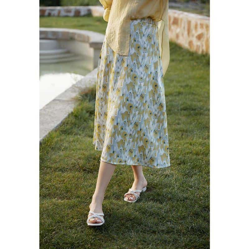 Stylish women's yellow floral maxi skirt, perfect for casual and summer wear, made from lightweight, breathable fabric for comfort and style.