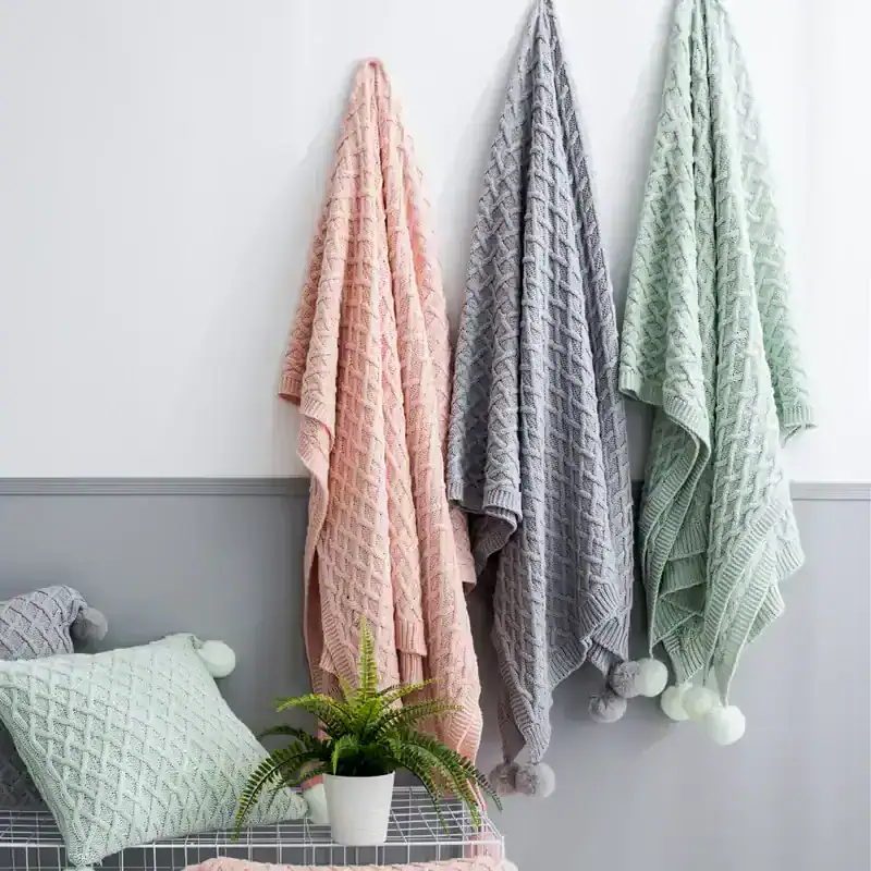 Add a layer of warmth and style to your home with our Soft Knitted Diamond Pattern Throw Blanket. This luxurious blanket, available in green, pink, and grey, is designed to bring both comfort and elegance to any space. Made from 100% high-quality acrylic, it feels incredibly soft and lightweight while still providing the perfect level of coziness. The playful PomPom tassels and intricate diamond knit pattern make this throw a decorative statement piece for any room, blending modern design with timeless comfort.
