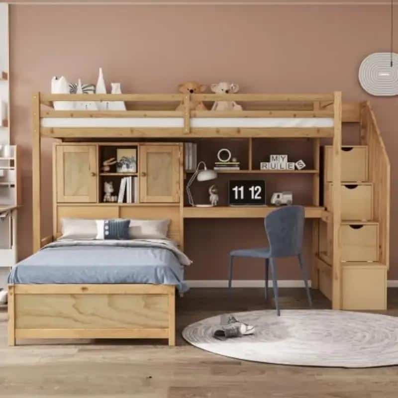 • Multifunctional Design: Combines a bunk bed, storage, and a desk in one unit.