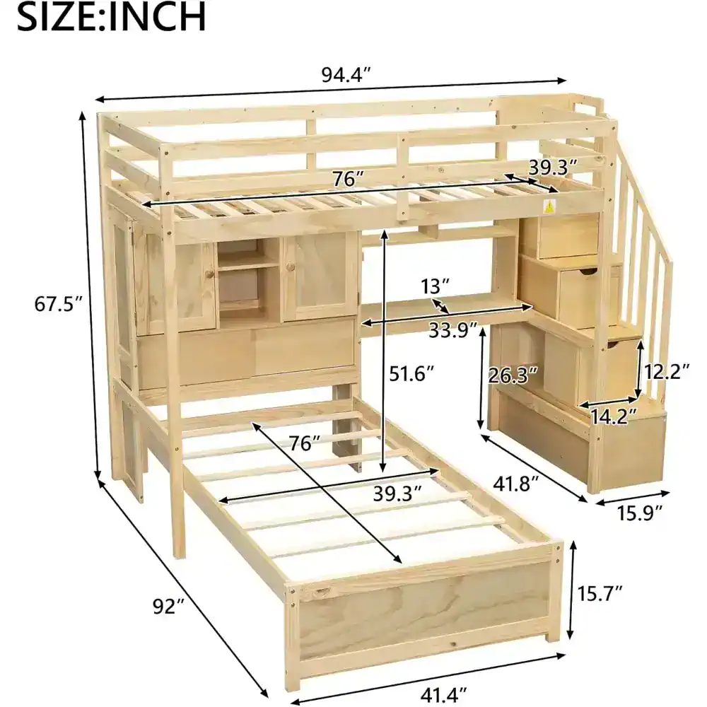 The twin-over-twin design is ideal for siblings sharing a room or hosting overnight guests. Its multifunctional layout is a great fit for smaller spaces, providing comfortable sleeping arrangements and a practical workspace in one compact unit. Measuring 94.4 inches long, 92 inches wide, and 67.5 inches high, this bed is designed to fit seamlessly into most bedrooms without compromising functionality.