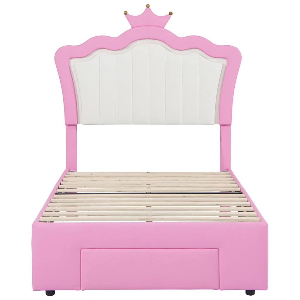 Give your little princess the bedroom of her dreams with this charming twin size upholstered bed frame. The soft pink and white tones create a serene and delightful atmosphere, while the luxurious crown headboard brings a touch of elegance and whimsy to the room. Perfect for any young dreamer, this bed is designed to provide both comfort and style, turning every night into a royal adventure.