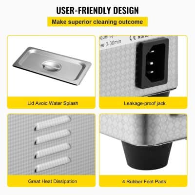 • Humanized Design: Compact size with an 800ml tank, equipped with a lid to prevent water splash, leakage-proof jack, and efficient heat dissipation. Perfect for multiple scenes, including jewelry, lab, circuit boards, dental devices, dishware, and industrial applications.