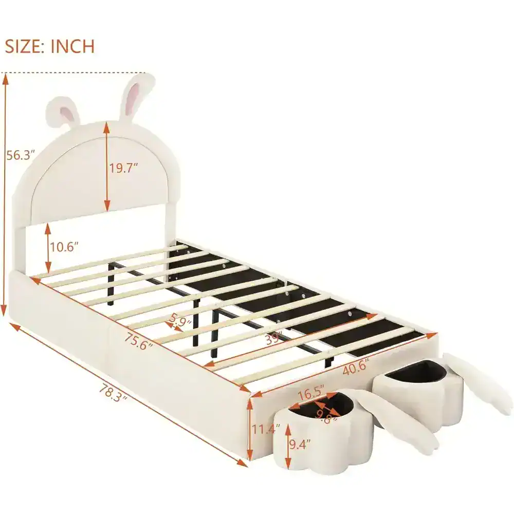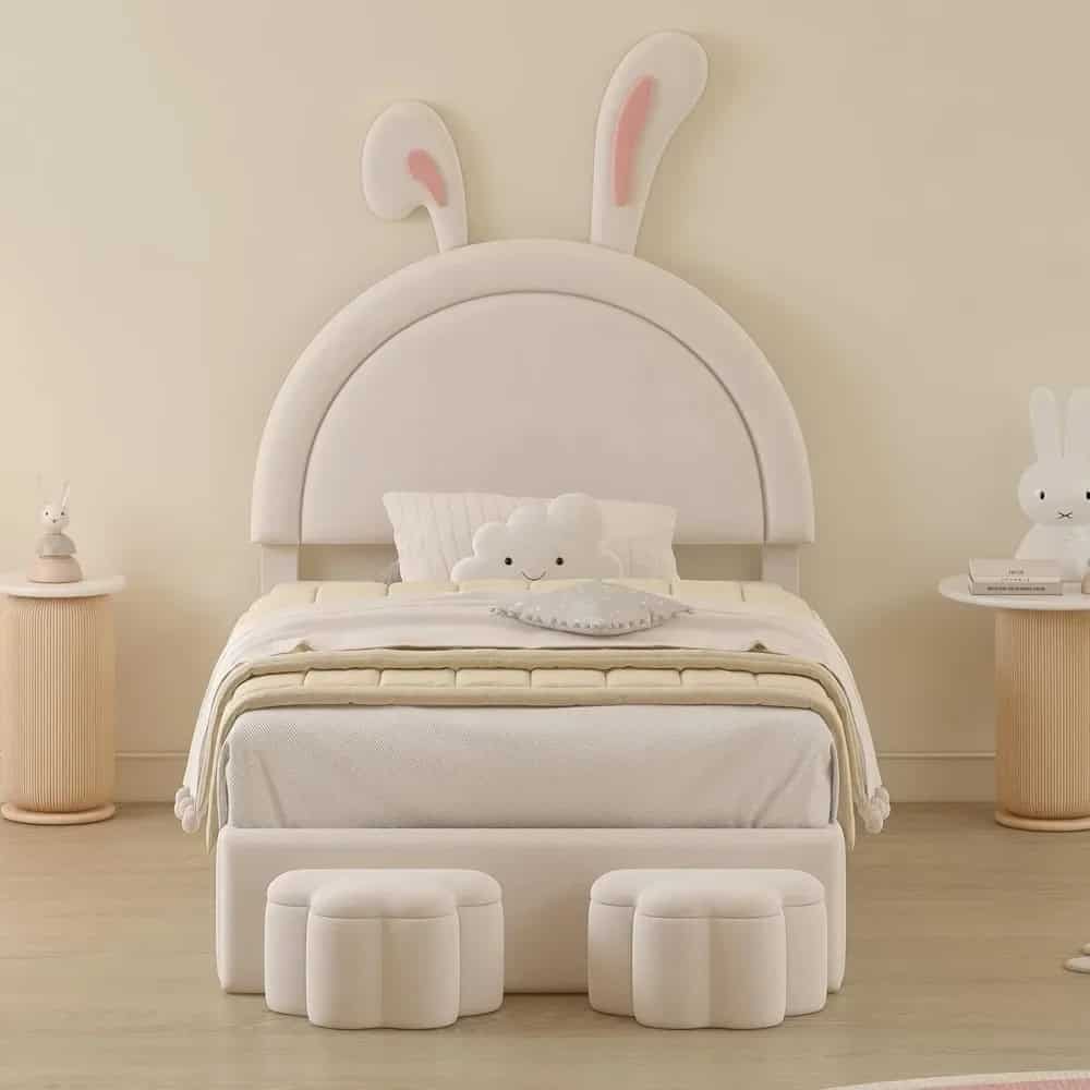 Perfect for creating a fun and functional space, this velvet upholstered bed with its whimsical rabbit design adds character to any bedroom. The soft velvet texture invites your little one to relax while offering durable support for years of use. The bed’s sturdy frame ensures safe and reliable sleep, while the added storage stools keep the room tidy and organized. Whether it’s time to nap, read a book, or store away toys, this bed is a versatile addition to any child’s room.