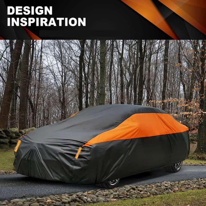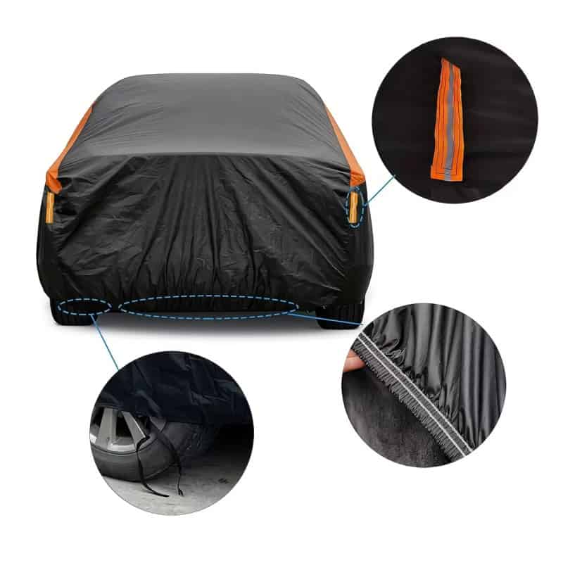- All-Weather Protection: Crafted from 190T polyester taffeta and PU material, this car cover offers unbeatable waterproofing, UV protection, and dust resistance. It ensures that your vehicle remains safe and clean in any weather.