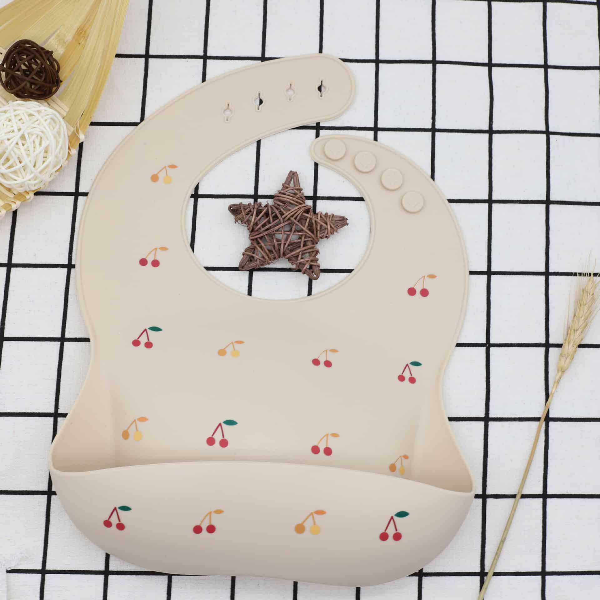 Cherry-themed baby silicone bib featuring adjustable neck straps and a food catcher, perfect for feeding time, with a cute cherry print design for infants.