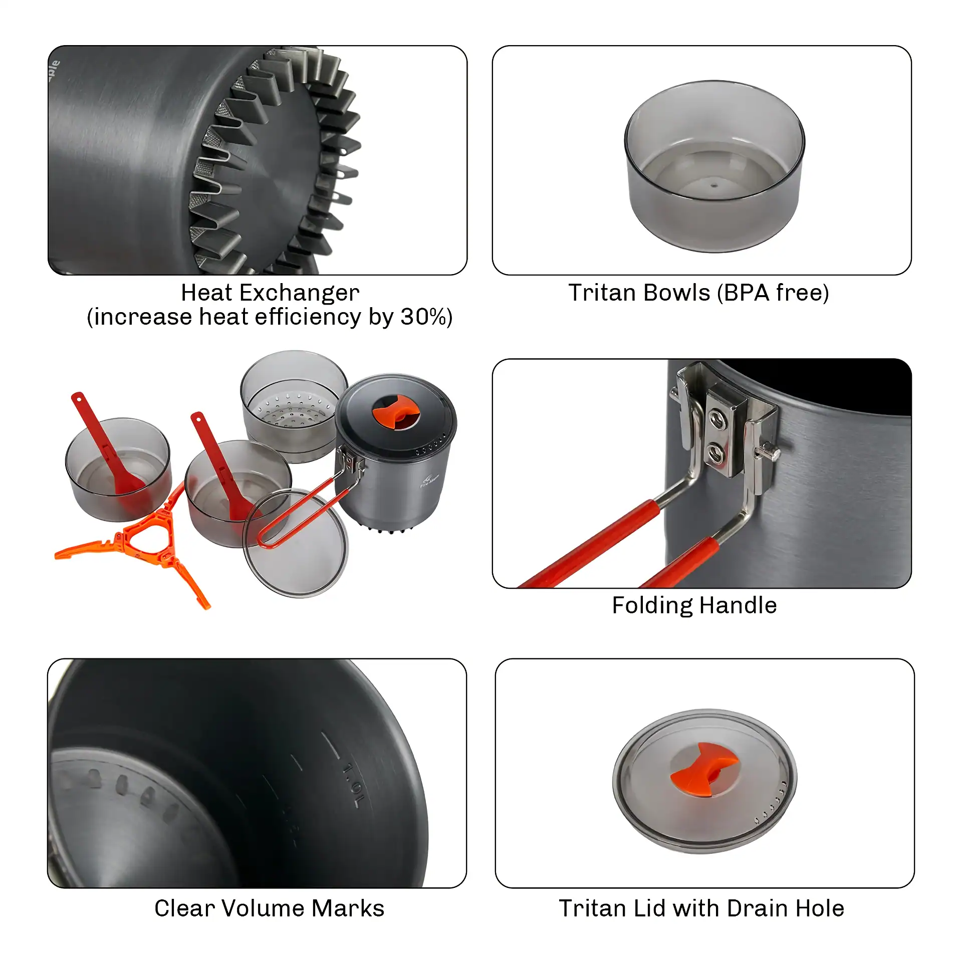 Elevate your camping cuisine with the Windproof Camping Cookware Kit with Heat Exchanger, a versatile and durable solution for outdoor chefs. Designed specifically for campers and travelers, this kit offers efficient, windproof heating in a compact, foldable design. Its 1-liter capacity is perfect for solo adventurers or small groups, allowing you to prepare delicious meals in nature with ease. Crafted from hard-anodized aluminum, this cookware set is lightweight yet sturdy, making it an ideal addition to any camping gear collection.