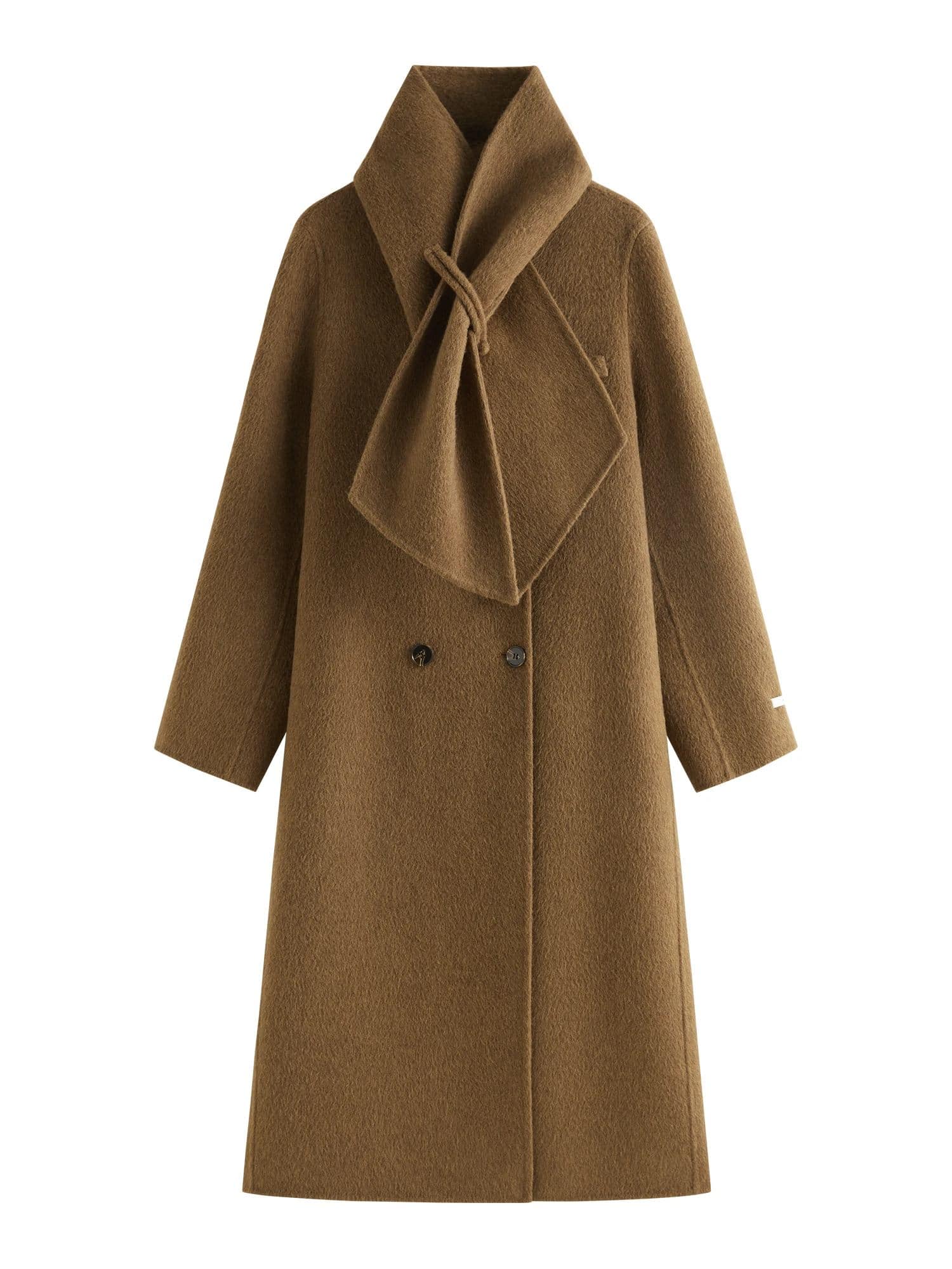 Luxurious brown wool coat with unique scarf-like collar, double-breasted design, perfect for winter fashion. Elegant and cozy outerwear from Monalisa Store.