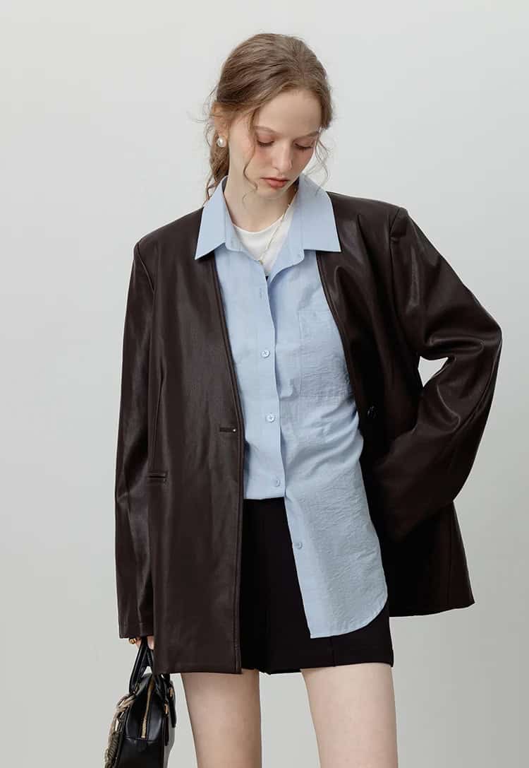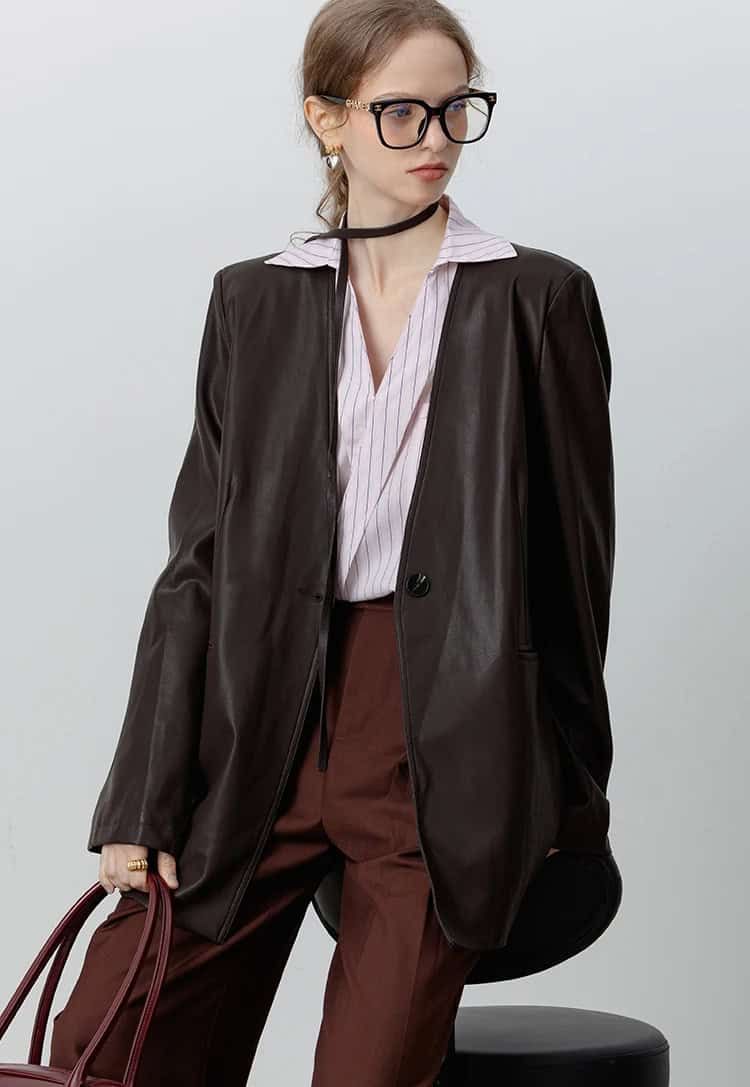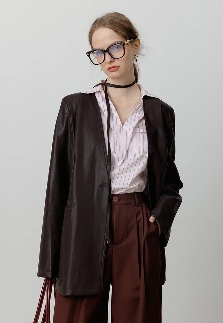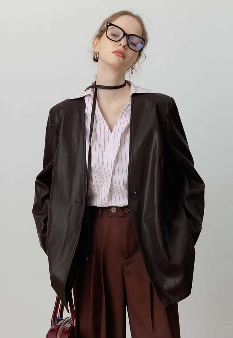 This Loose PU Leather V-neck Jacket with Ribbon brings a chic and vintage touch to your winter wardrobe. With a beautiful brown hue and a flattering design, this jacket seamlessly blends style with comfort. Crafted from high-quality PU leather, it’s soft yet durable, perfect for the cooler months. The single button closure and the V-neck collar create an elegant silhouette, while the added ribbon detail gives it a unique retro flair. Ideal for those who love timeless fashion with a modern twist!