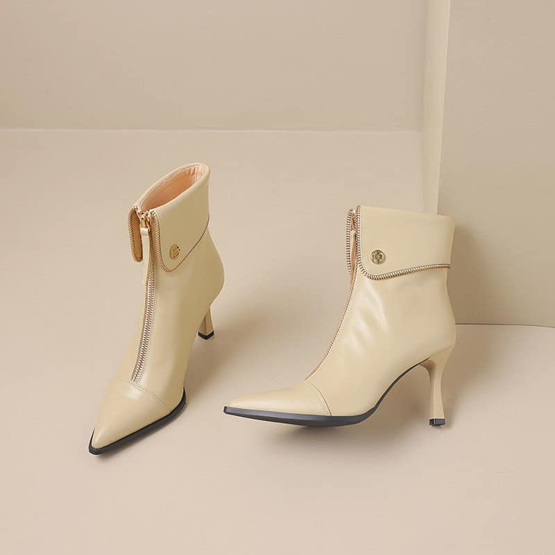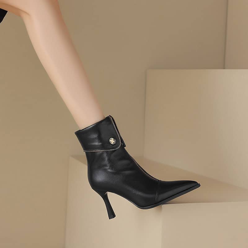 Turn heads and embrace your confidence with these stunning pointed-toe ankle boots. Designed to blend modern fashion with timeless elegance, these high-heeled boots are the perfect addition to your wardrobe. Crafted with genuine cow leather and a sleek 3.15-inch (8 cm) thin heel, these boots exude sophistication and style. The retro turned-over edge and chic front zip closure add an edgy yet refined touch, making these boots a must-have for the autumn and winter seasons.