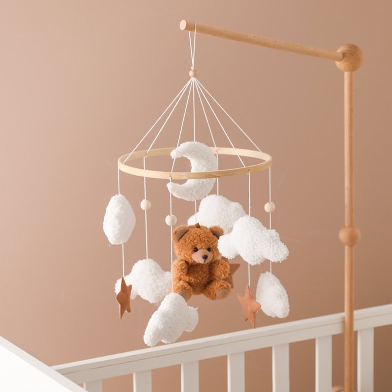 Create a soothing and visually stimulating environment for your little one with the Wooden Baby Crib Mobile. Featuring adorable felt cartoon bear characters and delicate hanging clouds, this crib mobile is the perfect combination of aesthetics and functionality. Crafted from high-quality wood and soft felt materials, it is designed to entertain and comfort newborns while also aiding their sensory development. The optional music box feature enhances relaxation with gentle melodies, making it an excellent addition to your baby’s nursery.