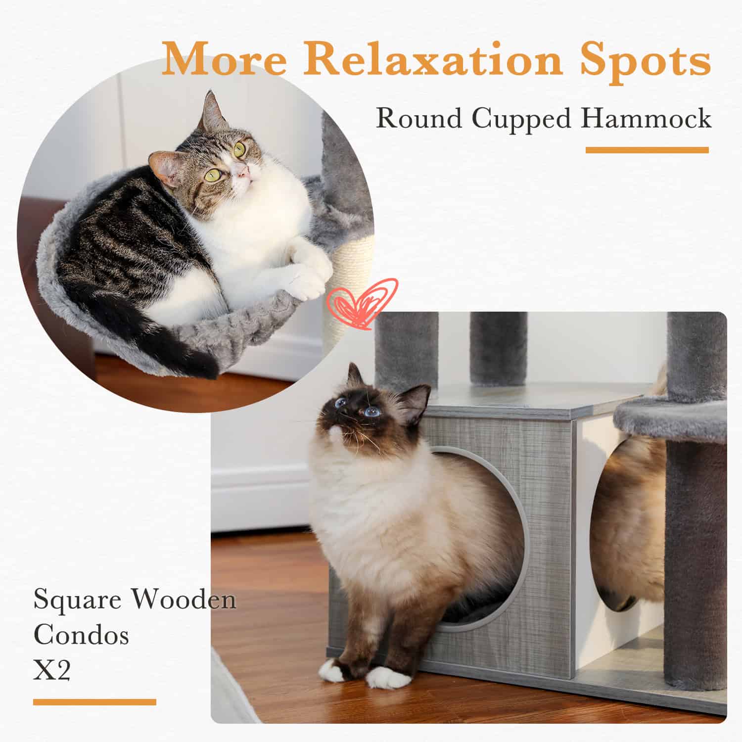 Whether your cats love to climb, scratch, or nap, this cat tree has it all. The top perch offers a high vantage point for your cats to survey their surroundings, while the spacious condo provides a private retreat for peaceful naps. The hammock adds a fun, swinging element for playful cats, and the scratching posts keep claws healthy and sharp.
