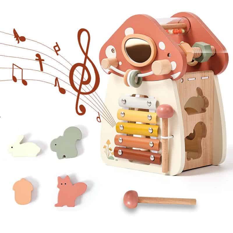 - Engaging Mushroom Design: This toy’s compact, wooden mushroom shape is full of playful elements, from the mirrored mushroom head to the colorful beads and shape blocks.