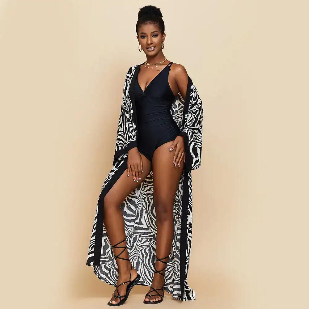 Our Zebra Print Long Sleeve Beach Cover Up Kimono Dress is your go-to piece for all your beach outings. Whether you’re lounging under the sun, sipping cocktails at a beach bar, or strolling along the shore, this versatile cover-up effortlessly elevates your beach look.